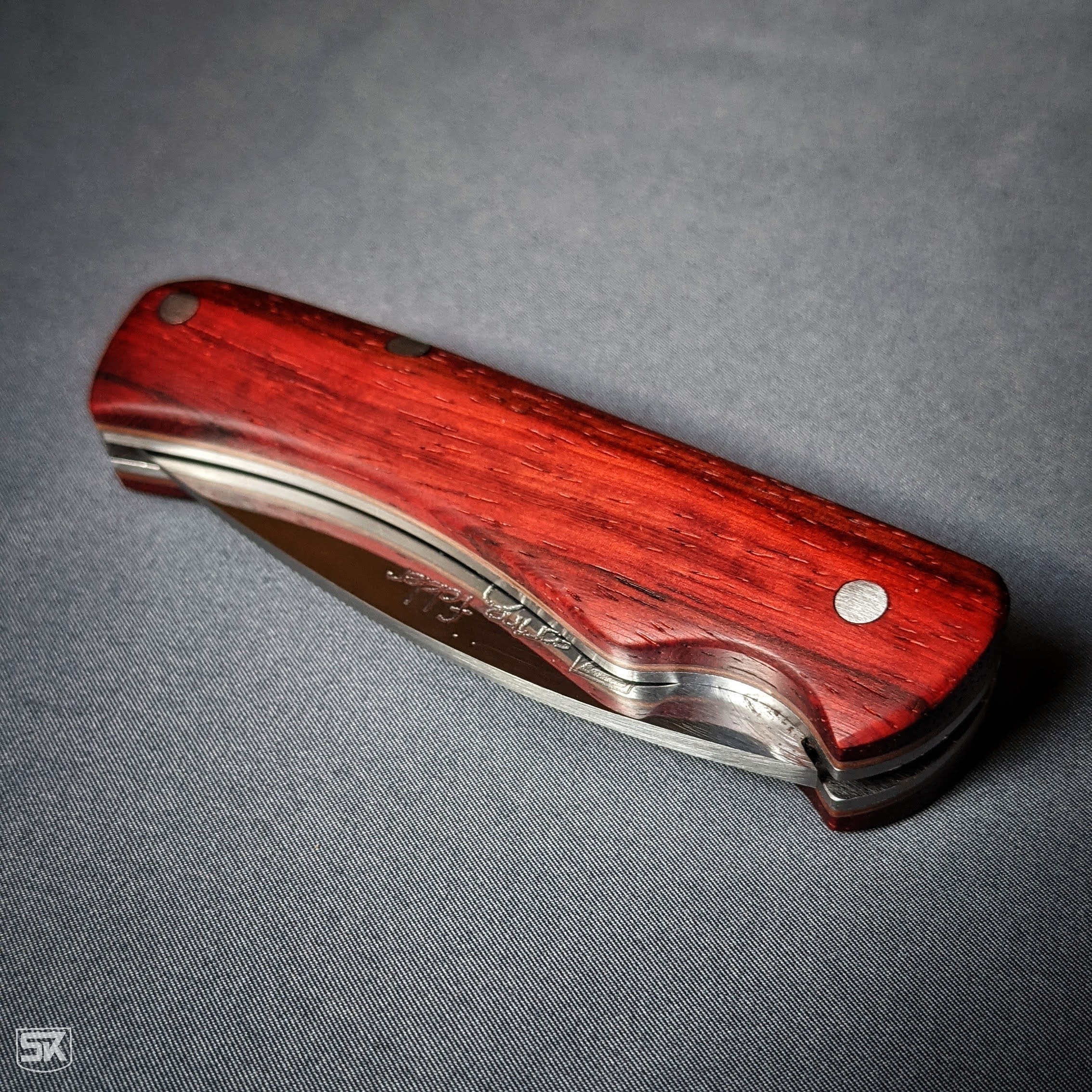 My first folding knife model. The spring arrested folding mechanism works like on Swiss Army Knives. The blade is held in the opened or respectively closed position by a strong steel spring that blends into the spine of the handle. The whole mechanism lives inside a strong steel frame. There are no screws, everything is glued up with epoxy. The liners are laminated grey paper and a layer of pearwood veneer to give it a lighter two-color tone. in the closed position, the edge of the blade does not touch any inner parts of the knife to keep it sharp. The handle scales are made out of a nice red Padouk wood.